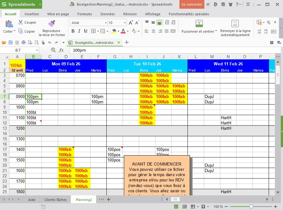 une copie d'écran du planning sur Excel pour iPad. Deux