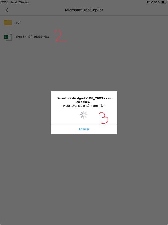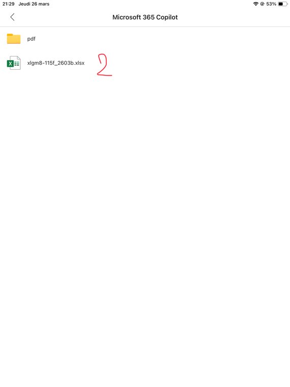 Installez et ouvrez MS-Excel (ou MS-Office). Cliquez sur le fichier de facturation et gestion de stock ExcelgestionMobile v8.XLSX (2), qui doit avoir été placé là (p.ex. grâce à l'app Fichiers).