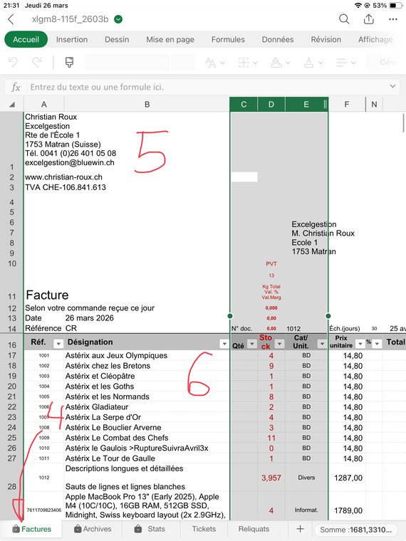 Rendez-vous sur la feuille Factures (4), vous voyez en haut à gauche mes coordonnées (5), vous pouvez mettre les vôtres (demandez-moi si vous voulez ajouter votre logo). Vous voyez les colonnes C-D-E qui sont sélectionnées (6).