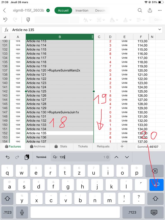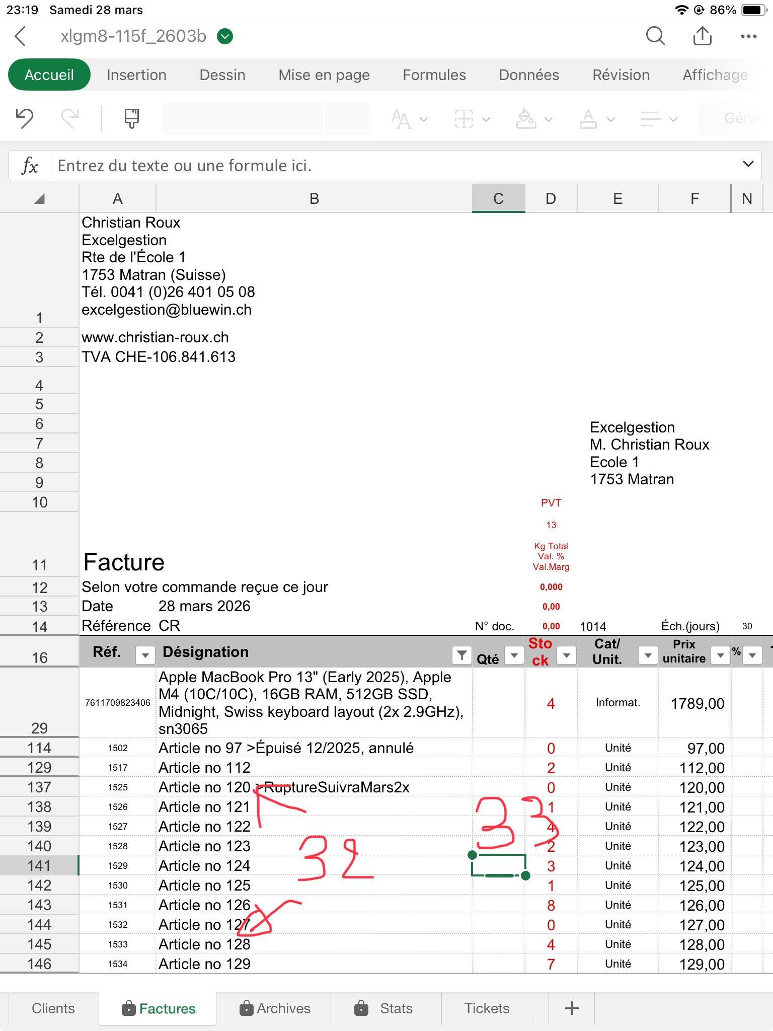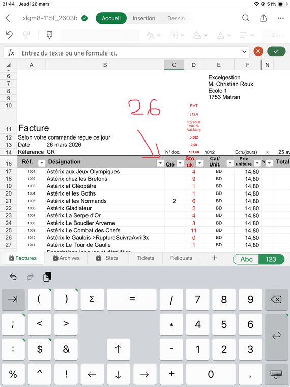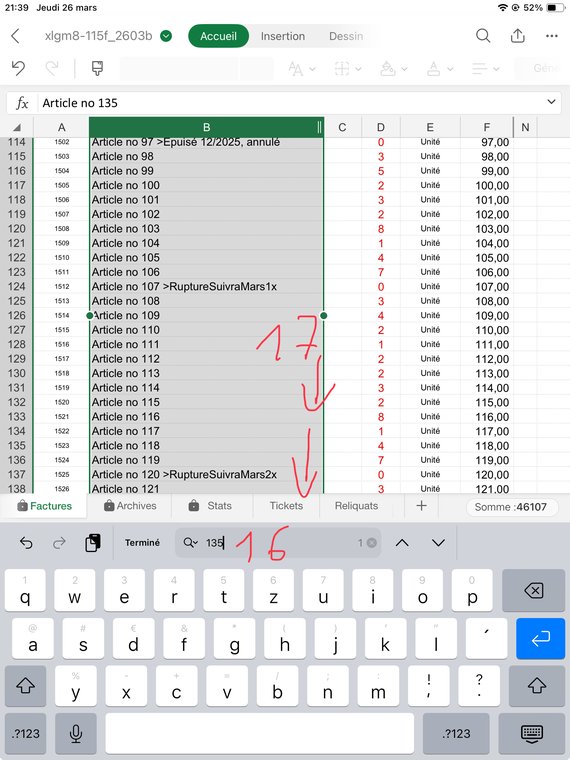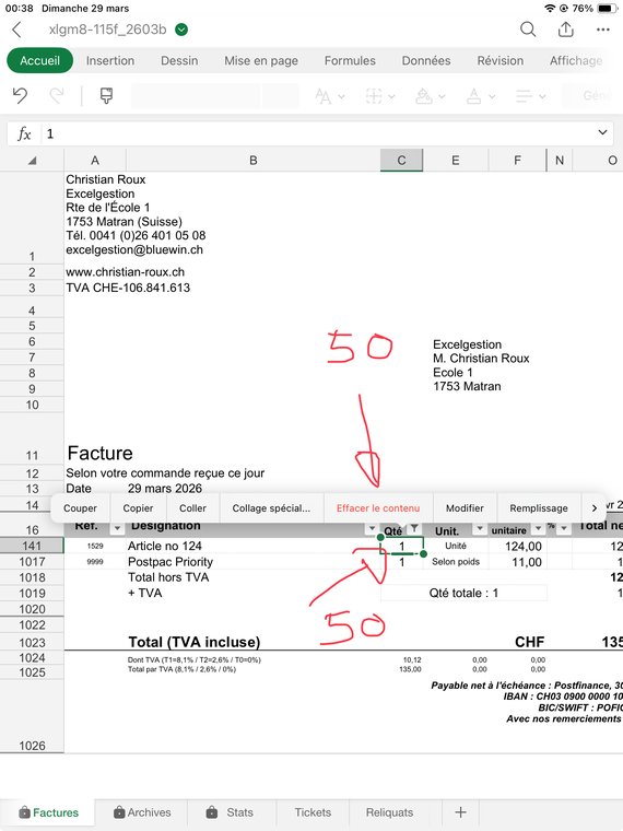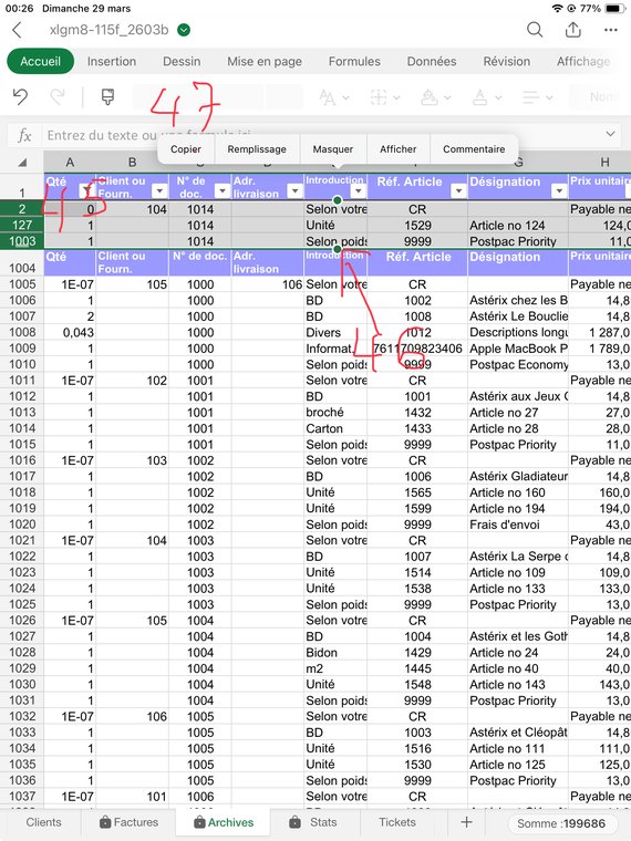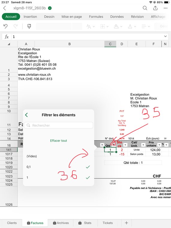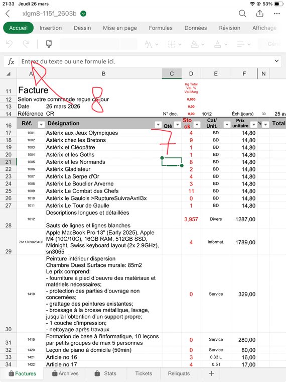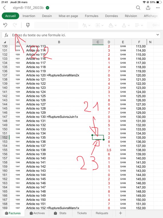 Contrôlez bien que la quantité facturée pour chaque article (sauf le port, ligne 1017) vous laisse un stock d'au moins "0". J'explique dans le fichier d'Aide comment gérer les reliquats: Dans ce cas ajoutez à la désignation de l'article, col. B, le texte suivant: ">RuptureSuivraJuin1x", ou le Juin est le mois où vous aurez renouvelé votre stock, et "1" la quantité que souhaitait votre client et qui n'a pas été livrée. Puis mettez une quantité de "0" en C141.