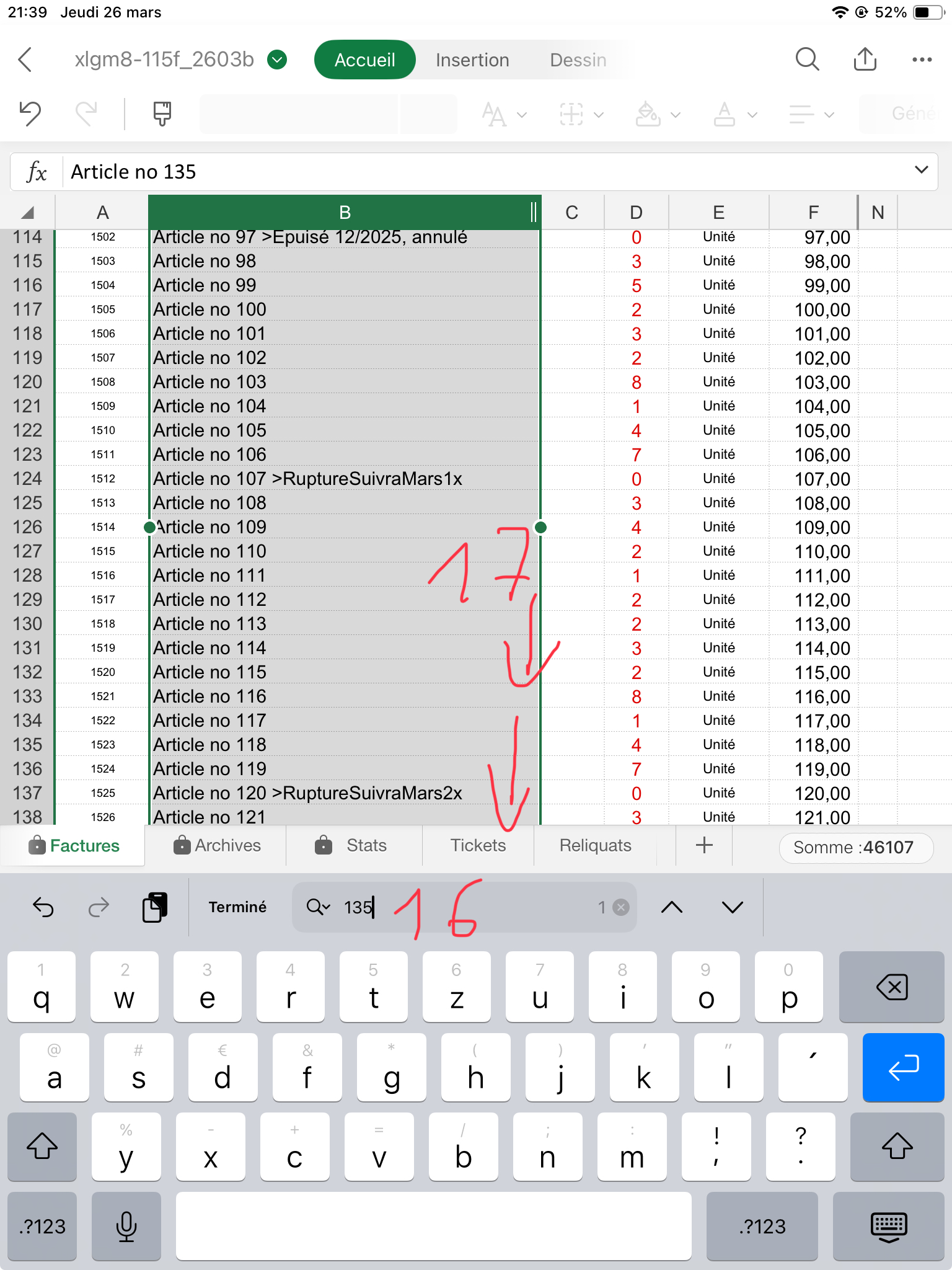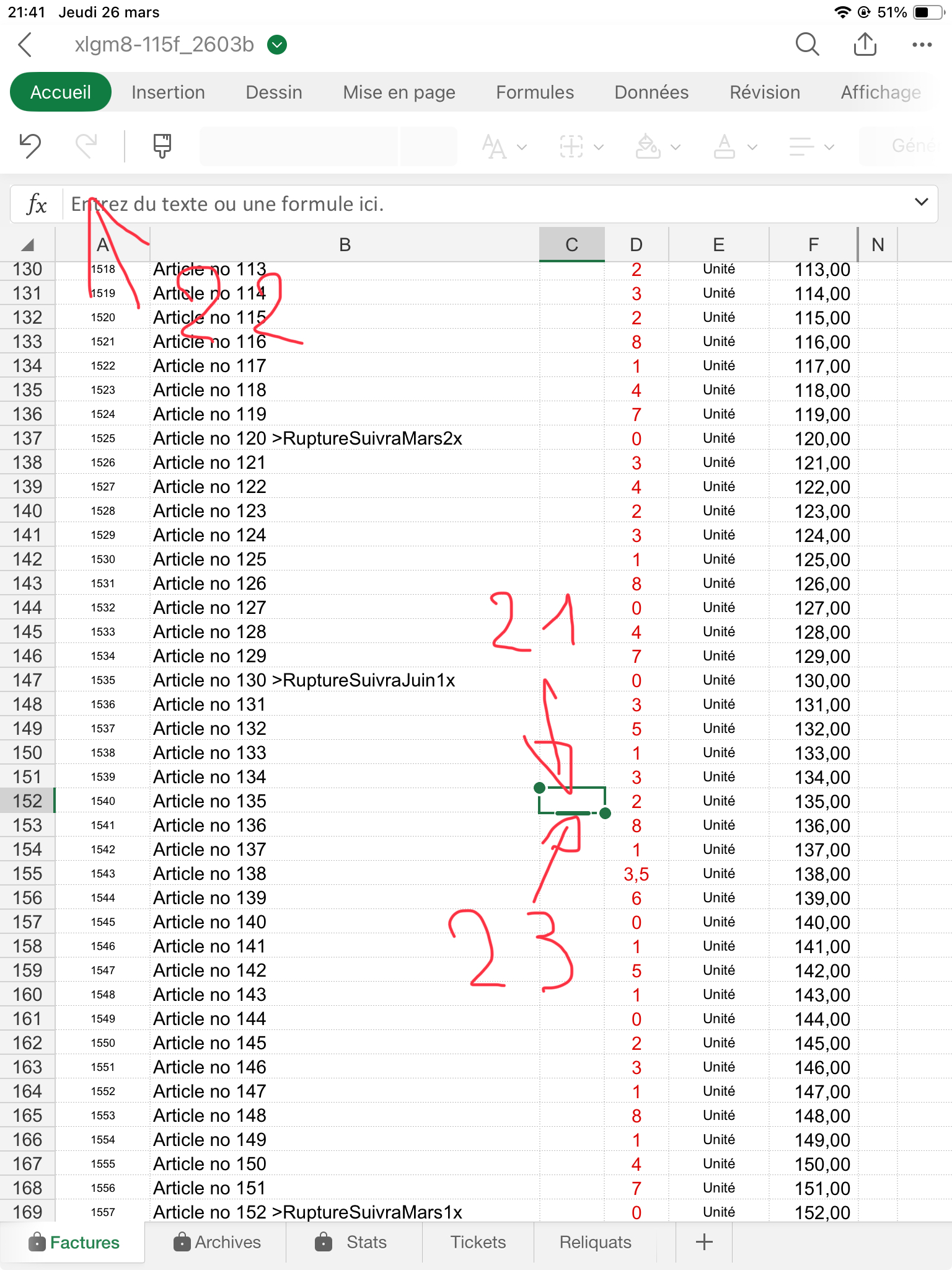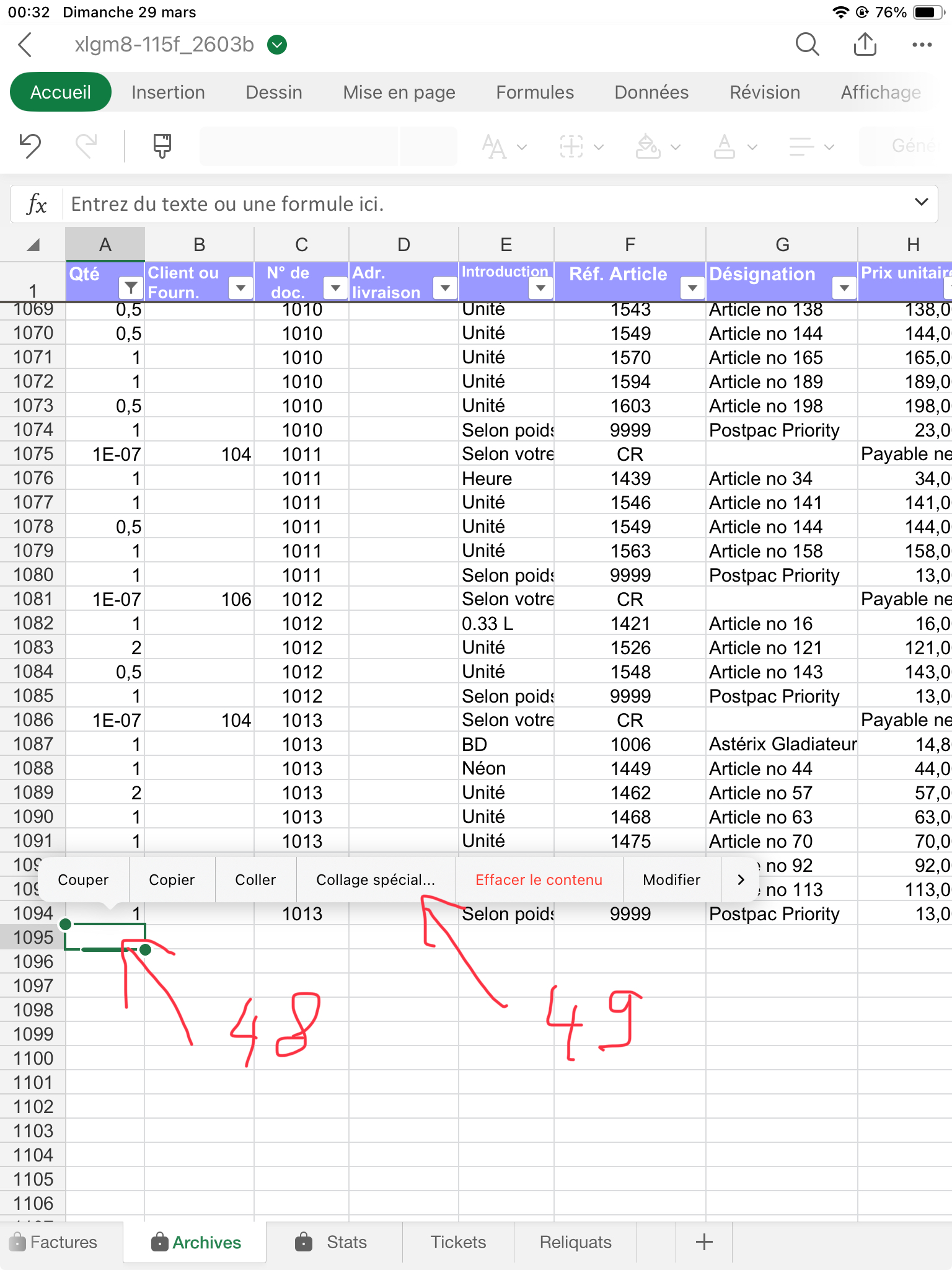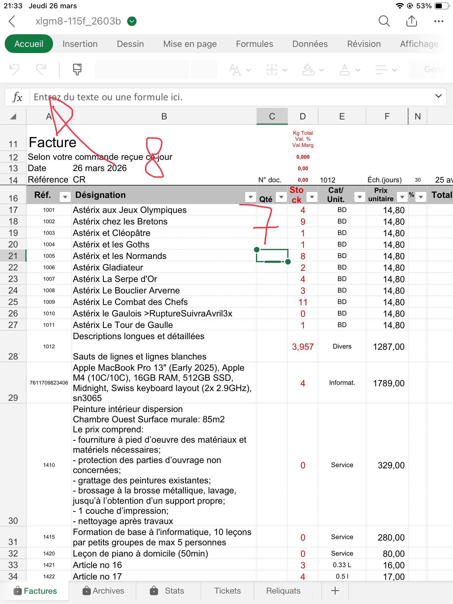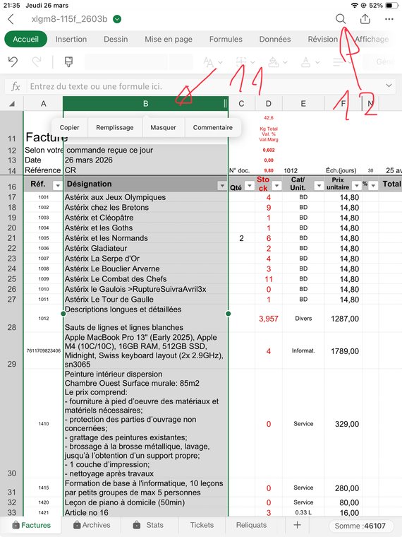 Contrôlez bien que la quantité facturée pour chaque article (sauf le port, ligne 1017) vous laisse un stock d'au moins "0". J'explique dans le fichier d'Aide comment gérer les reliquats: Dans ce cas ajoutez à la désignation de l'article, col. B, le texte suivant: ">RuptureSuivraJuin1x", ou le Juin est le mois où vous aurez renouvelé votre stock, et "1" la quantité que souhaitait votre client et qui n'a pas été livrée. Puis mettez une quantité de "0" en C141.