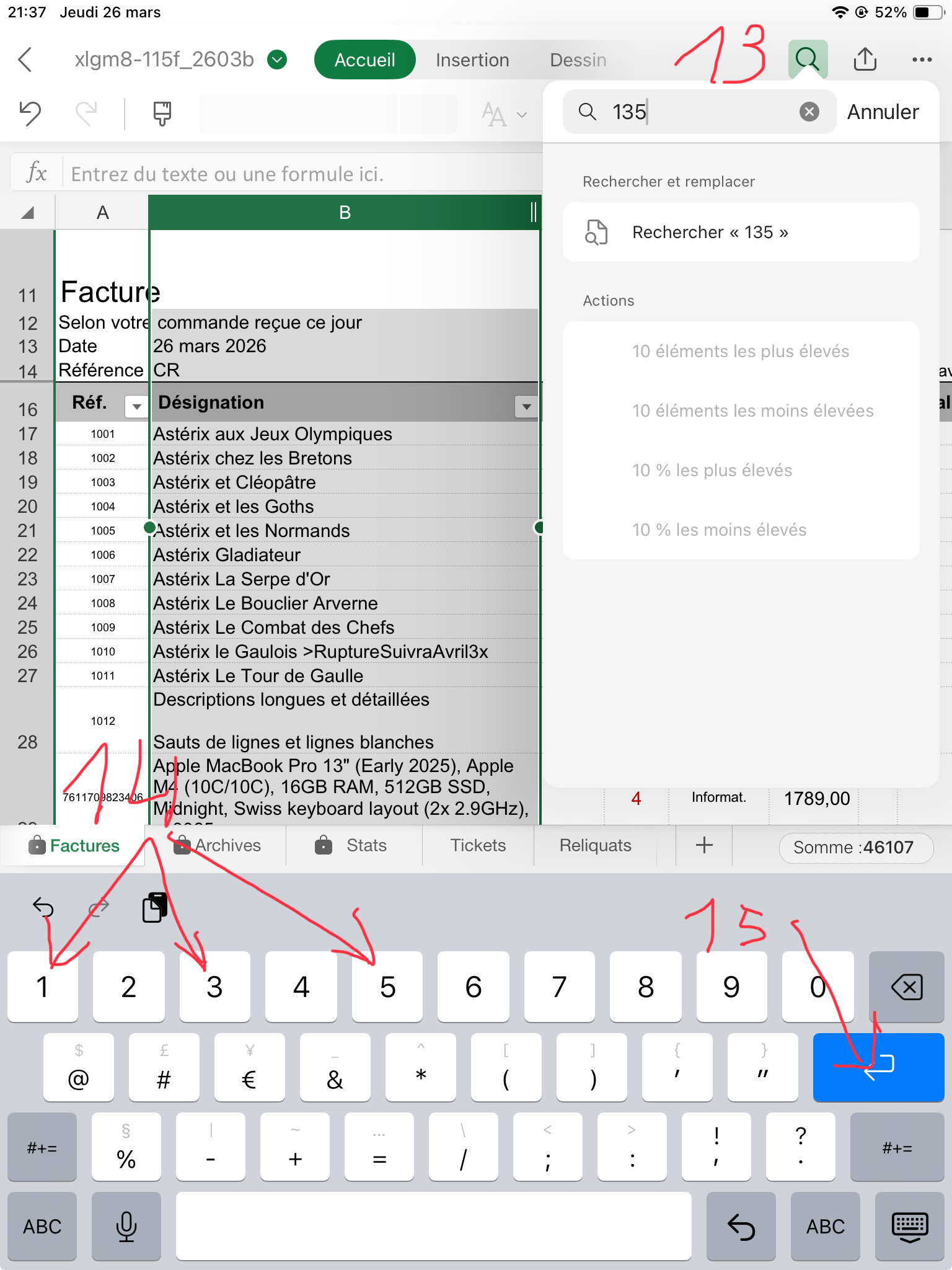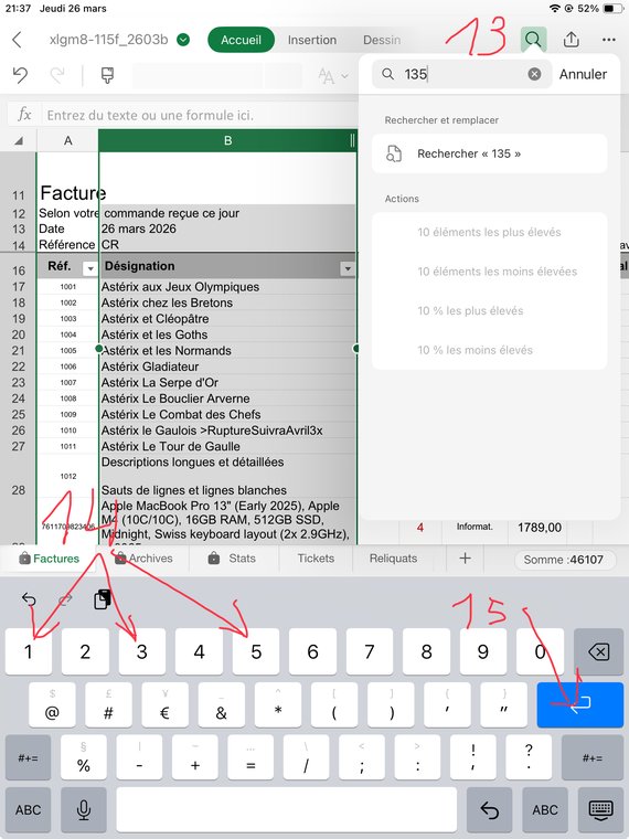 L'Outil Rechercher s'est ouvert (13), saisissez un mot de la Désignation, ici le mot est "135" (14) puis Entrée (15).