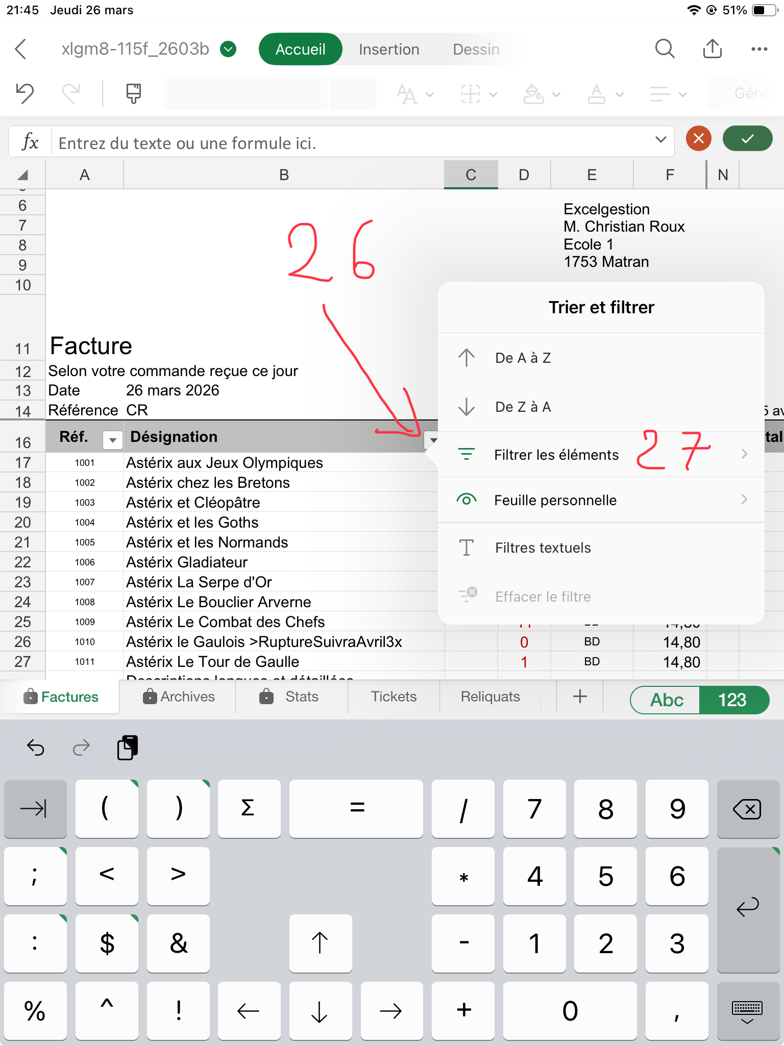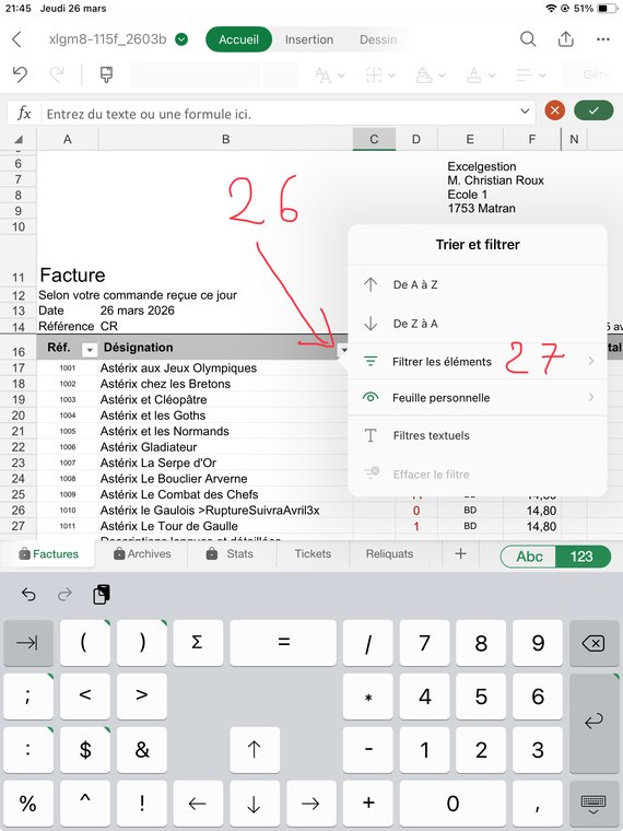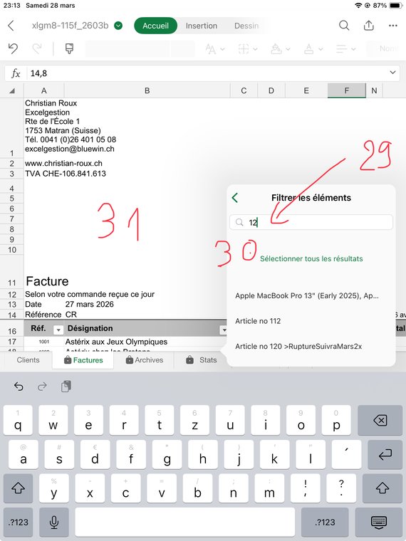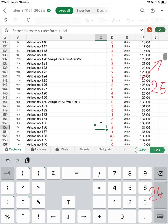 Puis Entrée (24) pour valider. Faites l'opération pour chaque article que vous voulez facturer. Puis remontez en haut de la facture en glissant le curseur (25). Note: pour les 1ères factures le curseur ne s'affiche pas, remontez en glissant l'écran.