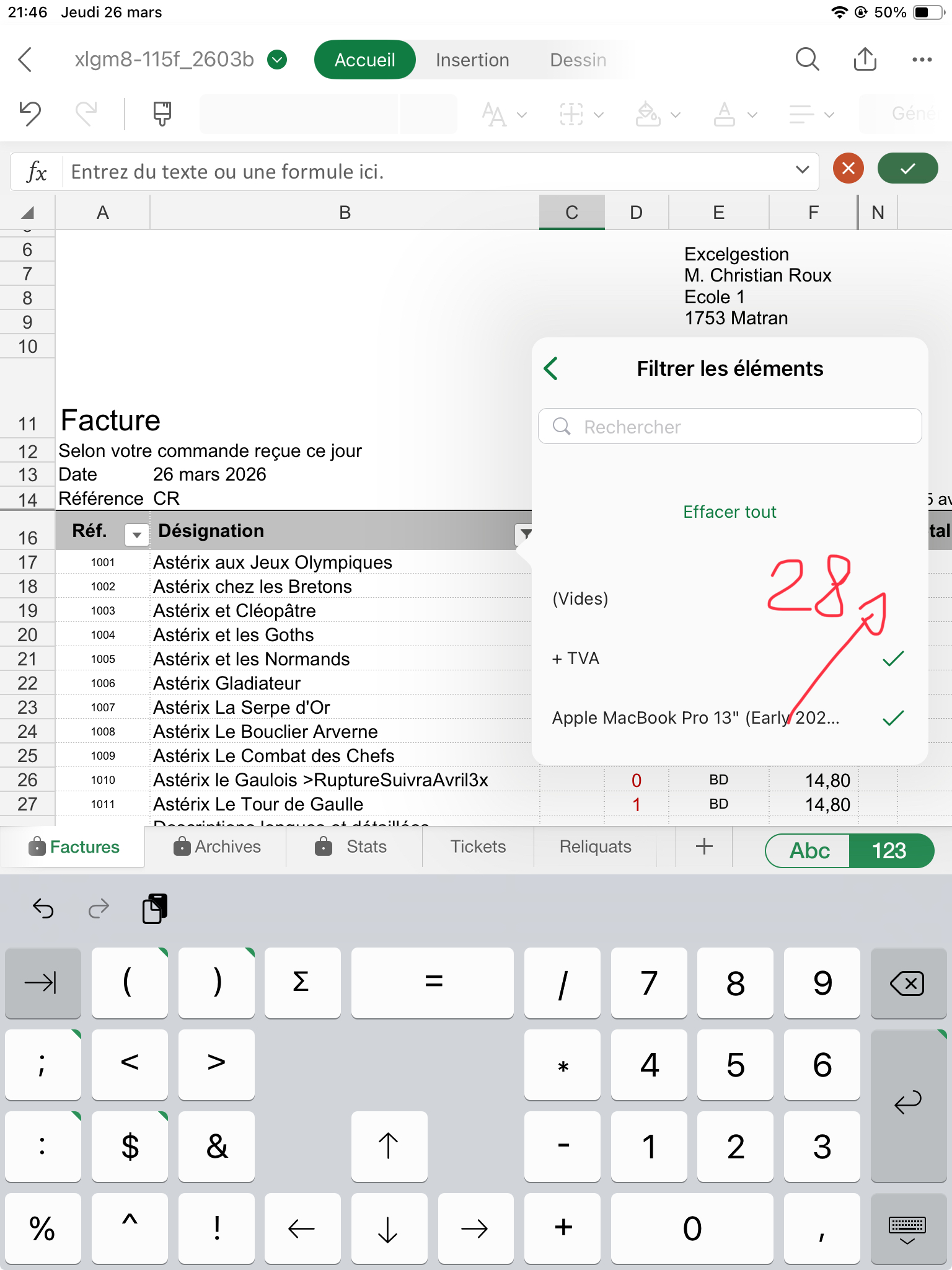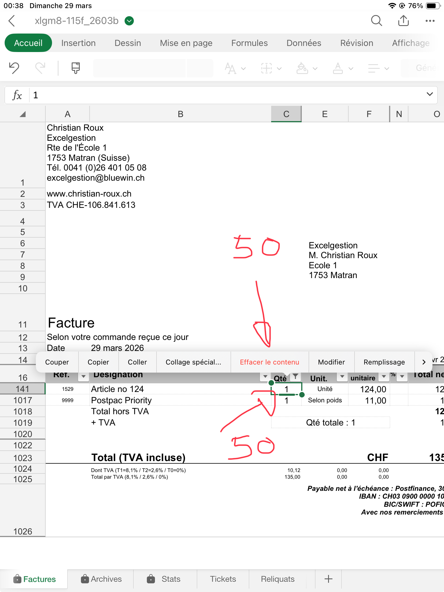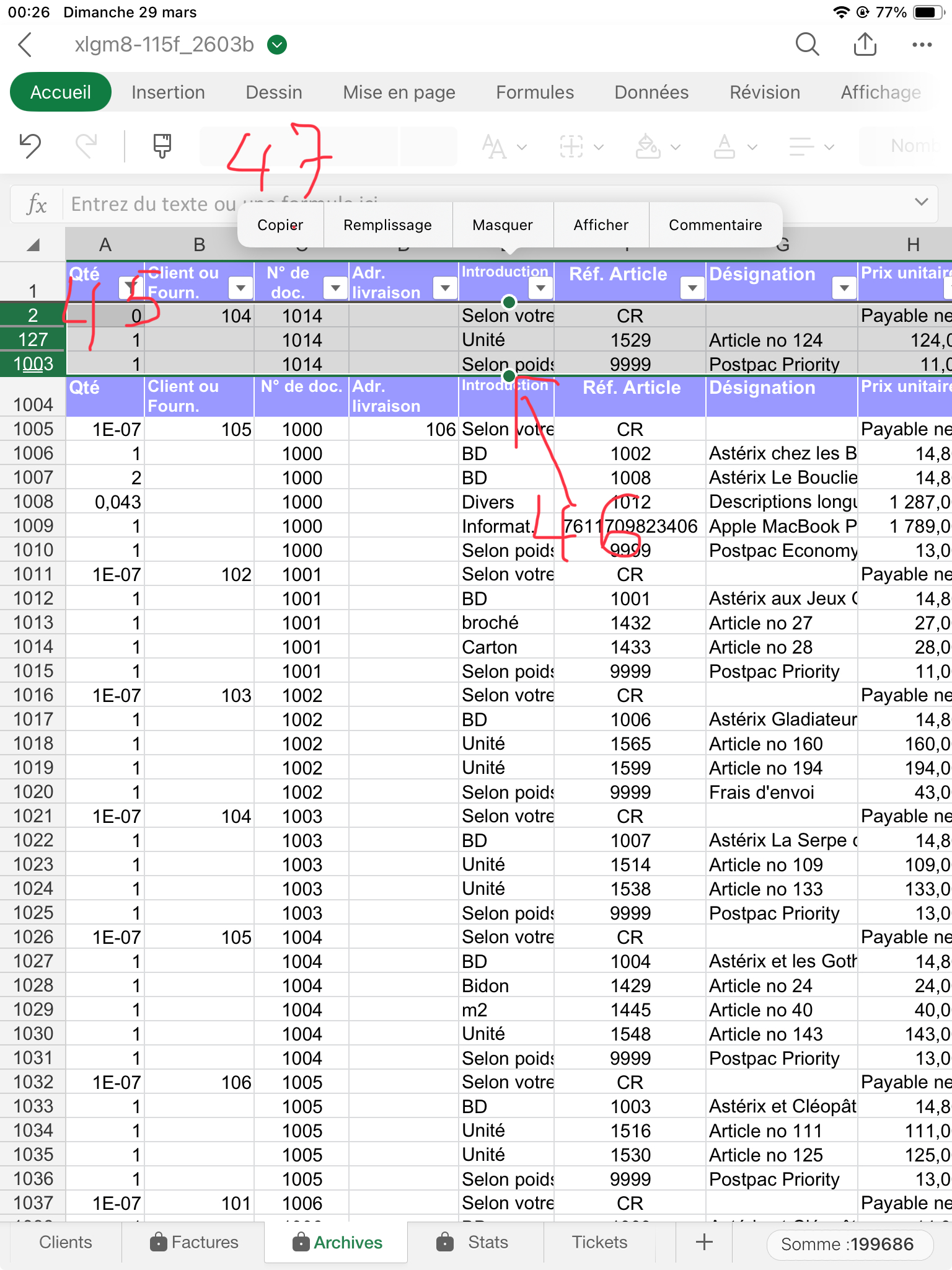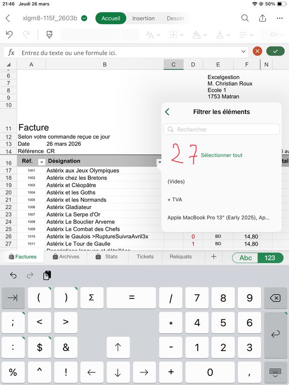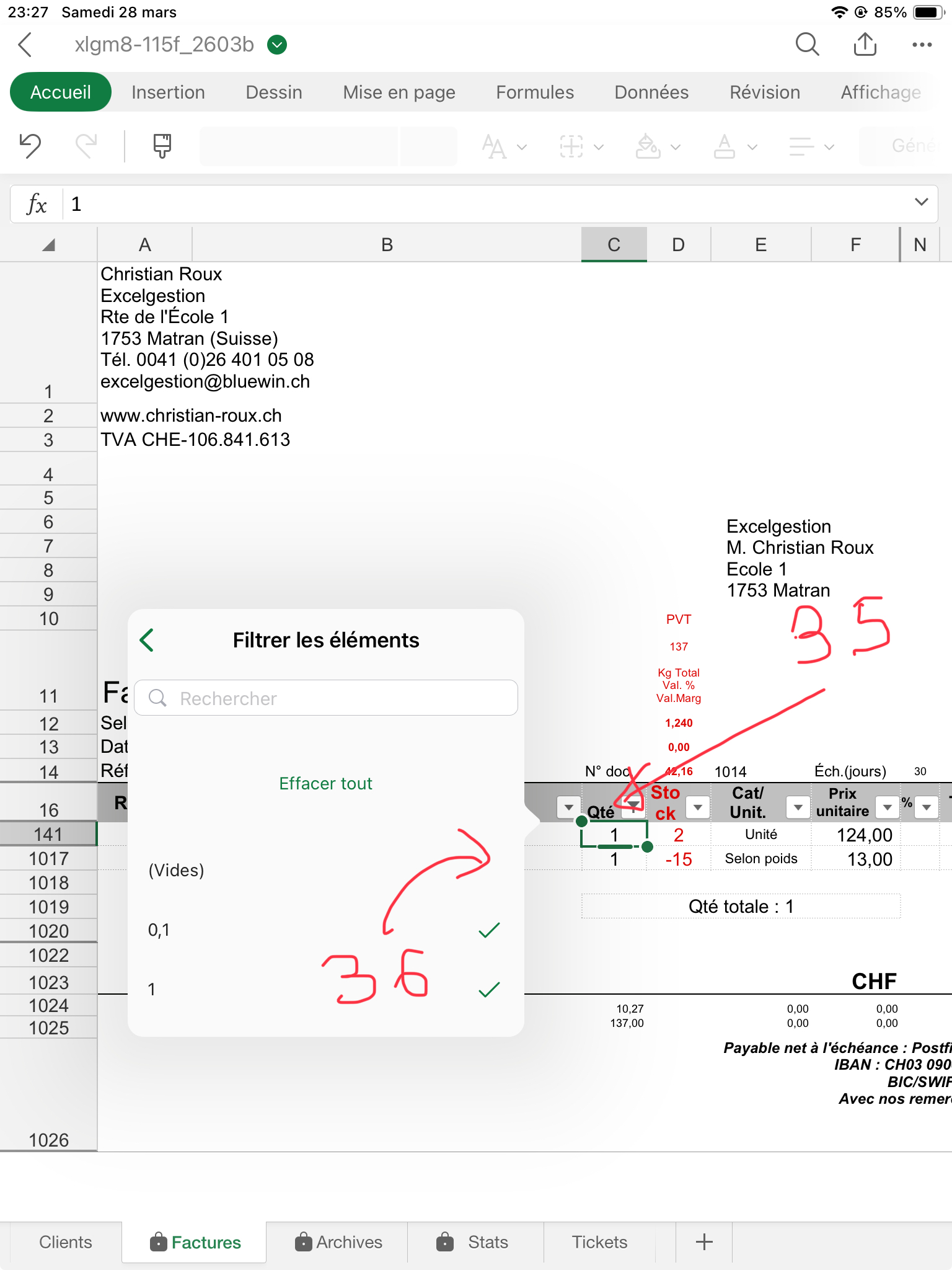 Sur feuille Factures, sélectionnez puis effacez les quantités (col. C) (50) sauf celle en ligne 1017 qui doit rester. Si vous aviez mis des rabais, effacez de même la colonne N. En C16, cliquez sur le filtre et sélectionnez "Effacer le filtre". Toutes les lignes s'affichent désormais.