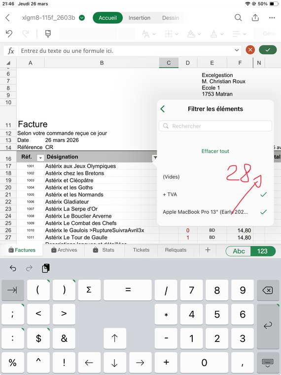 Le dialogue du filtre peut (selon les versions d'Excel), se présenter ainsi (16), l'article a été trouvé et se trouve (malheureusement) sous le clavier virtuel, descendez comme indiqué (17). Note: pour afficher les articles qui se cachent sous le clavier virtuel, vous pouvez aussi, après la recherche, presser la touche tout-en-bas à droite du clavier virtuel, ce qui masquera ce dernier et rendra l'article visible.
