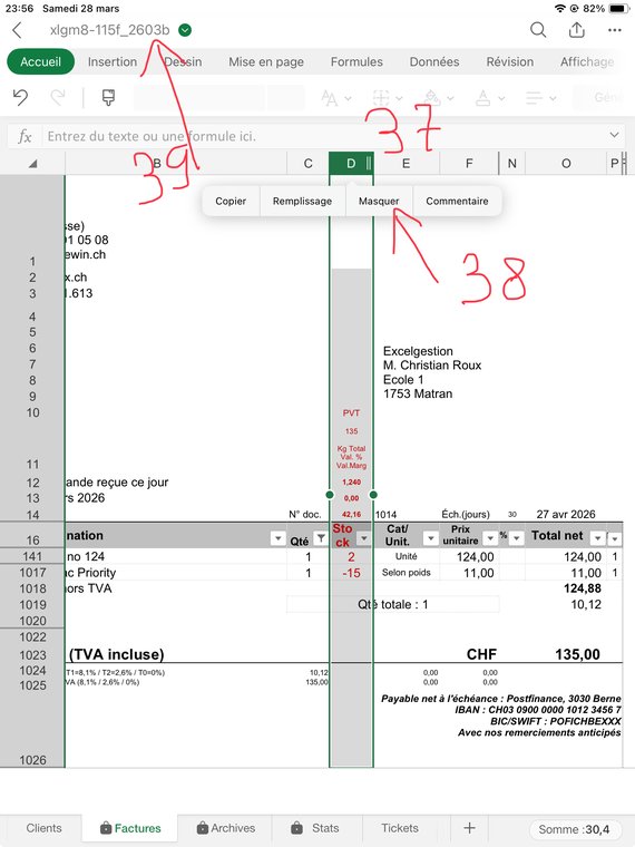 Il vous reste à masquer la colonne D en cliquant sur son en-tête (37) et cliquant "Masquer" (38). Puis cliquez tout en haut de l'écran à gauche, sur le nom du fichier (39) pour procéder à l'impression ou PDF.