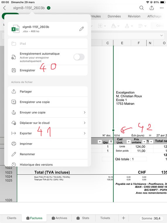 Cliquez sur "Enregistrer" (40) puis refaites l'opération pour ouvrir le Dialogue et cliquez sur Exporter (41). Suivez le dialogue, indiquez le chemin (path) dans lequel mettre votre fichier PDF, contrôlez bien que le fichier est en A4. Donnez au fichier PDF le nom de votre facture (en C16) le "1014" (42), que vous aurez mémorisé pour un instant. Non illustré: Vous pouvez aussi imprimer votre facture soit depuis ce dialogue ou depuis le PDF dans l'appli "Fichiers". Mais faites de toute façon un PDF, indispensable! Enregistrez encore votre fichier puis je vous expliquerai comment mettre le document aux Archives puis le remettre à zéro.