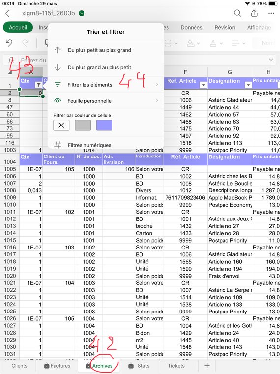 Rendez-vous sur la feuille Archives (42), allez tout en haut à gauche, en A1 (43), cliquez sur l'icône triangle pour ouvrir le filtre, puis cliquez sur "Filtrer les éléments" (44), comme vous avez vu plus haut cliquez sur "Sélectionner tout" (la totalité des lignes doivent s'afficher, puis "Sélectionner tout", puis décochez le "(Vides)". Enfin cliquez en dehors du filtre pour l'appliquer et le fermer.