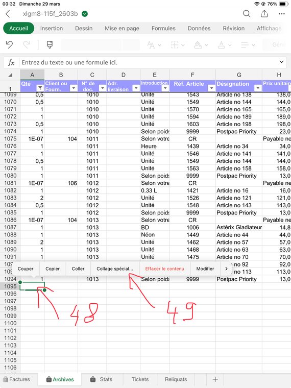 Cliquez directement sur la colonne A de la prochaine ligne libre (48) et sélectionnez "Collage spécial" (49) puis "Valeurs" (non illustré), il se passe 3-4 secondes et les lignes d'en haut se collent ici en bas, mais de façon désormais statiques. Ce sont vos archives.