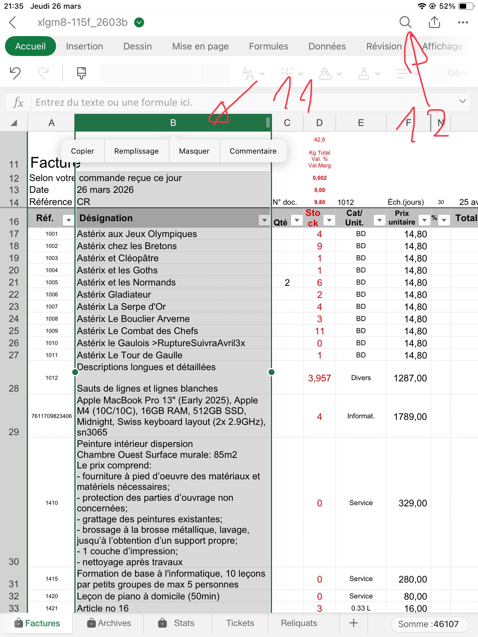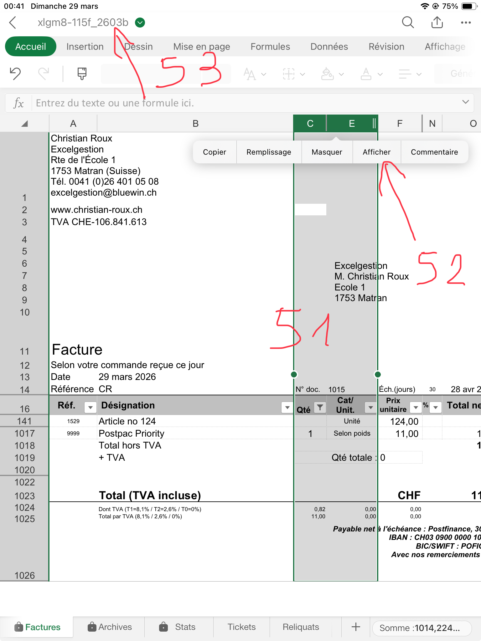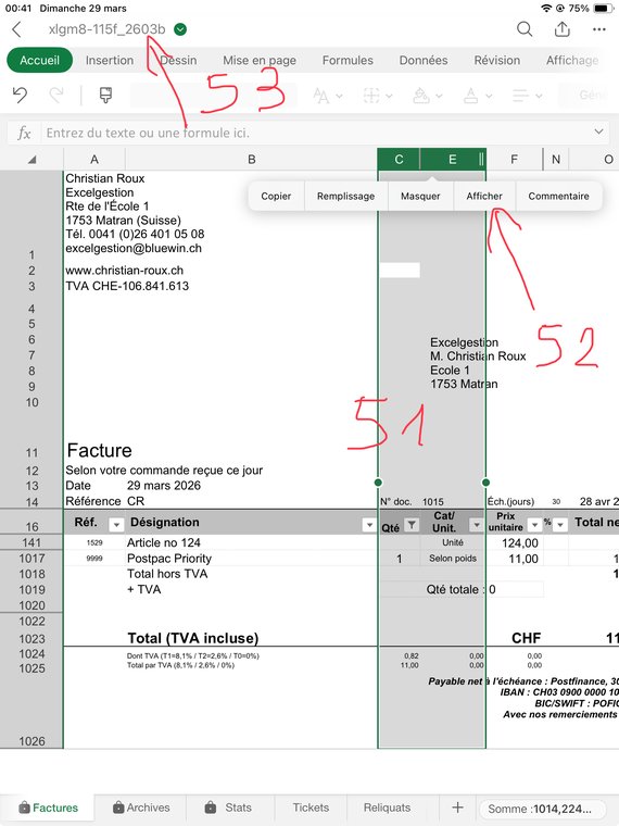 Puis sélectionnez les en-têtes des col. C-E (51) puis "Afficher" (52). Enregistrez le fichier/document (53). C'est tout! Vous pouvez faire une nouvelle facture.