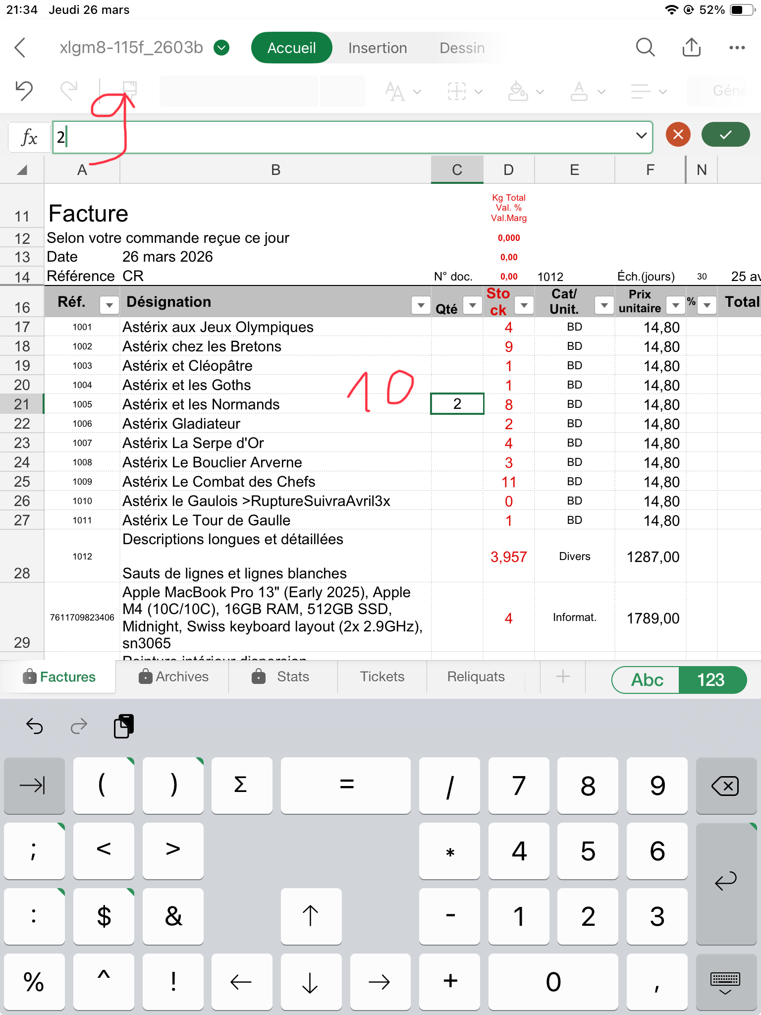 1.- Saisissez la quantité (9) qui s'affiche aussi en C21 (10). Vous pouvez répéter cette opération (glisser la liste des articles) pour chaque article à facturer (mais il existe 2 autres moyens que je vais vous montrer).