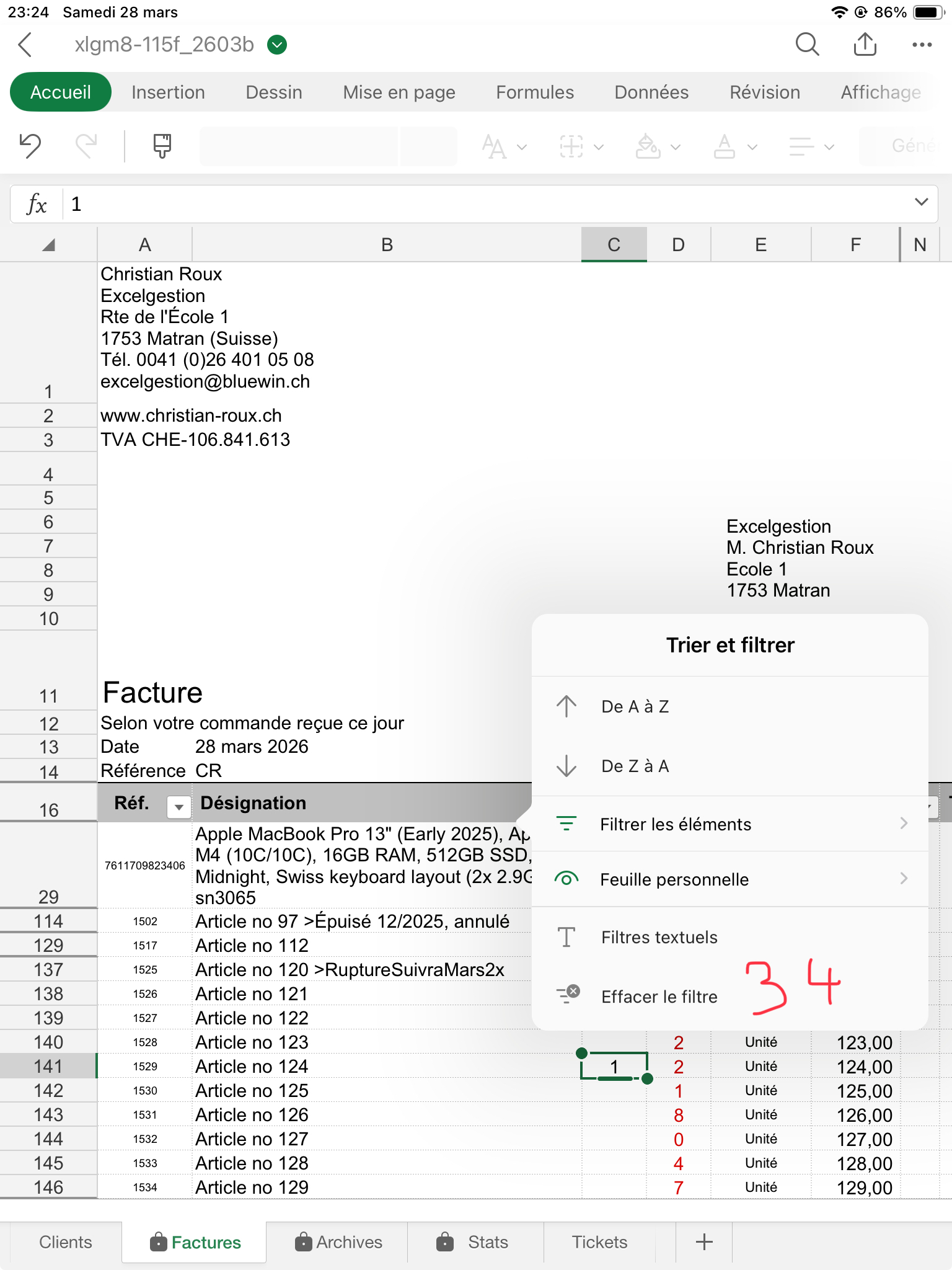 Vous allez ne voir QUE les lignes qui ont une quantité en colonne C. Fermez le filtre (en B16) en cliquant sur le triangle à droite de la cellule B16. Le filtre s'ouvre, cliquez en bas sur "Effacer le filtre" (34).